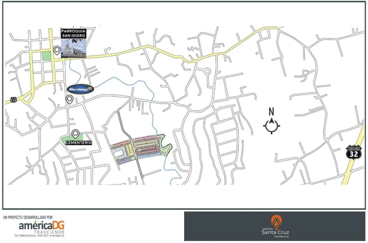 Residencial Jardines Santa Cruz. Consiste en 161 Lotes desde los 300m2 hasta los 473m2. Ubicación estratégica San Isidro de Heredia cerca de escuelas y colegios públicos y privados, supermercados, bancos y servicios públicos. Conectividad completa a la ruta 32.